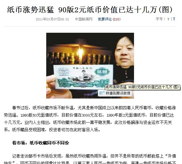 类似有:腾讯----------->纸币涨势迅猛 90版2元纸币价值已达十几万(图)_财经_腾讯网
