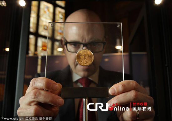 国际在线艺术收藏报道:英国伦敦,伦敦铸币办公室的工作人员拿着面值二十美元的“双鹰” 黄金硬币。美国大萧条时期,约有50万枚这样的硬币出厂。它们中的大多数在萧条期间被融化,以维持美国经济的稳定,共有13枚得以幸存。2002年,一枚这样的硬币以760万美元的价格拍出。