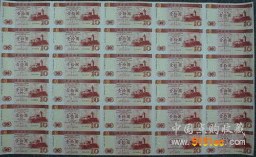 澳门10元双错整版钞俗称澳门大炮筒,目前被尊称为最有升值潜力的连体钞钞王之一。它是由中国银行及大西洋银行于2001联合发行。此套整版钞内含大西洋银行发行的10元券四十张整版钞一张、中国银行发行的10元券三十张整版钞一张,附有澳门金融管理局局长签发的“鉴定证书”,后四位号码均相同,装帧发行量1万套,面值700澳门元,面市之初约为2000元 。