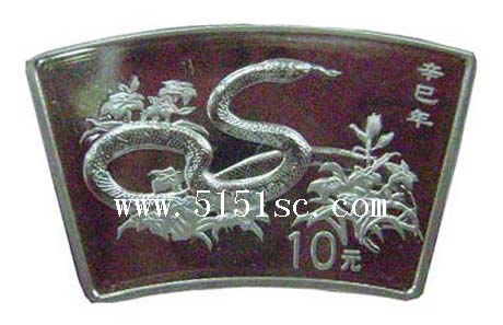 该扇形银质纪念币背面图案为银蛇图并刊面额。