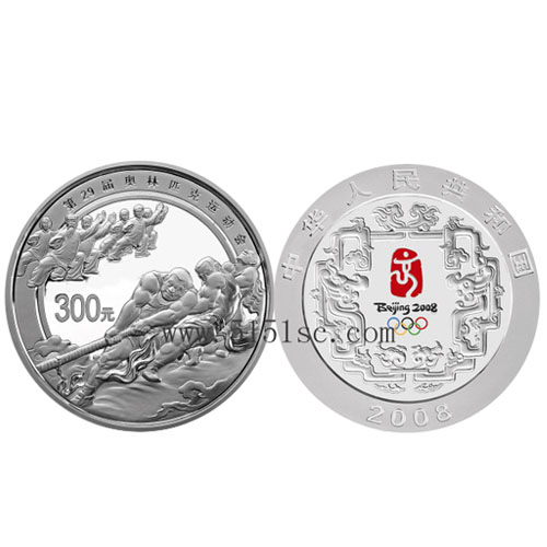 该套银质纪念币正面图案为第29届奥林匹克运动会会徽图案及中国传统对龙造型,并刊国名、年号“2008”。