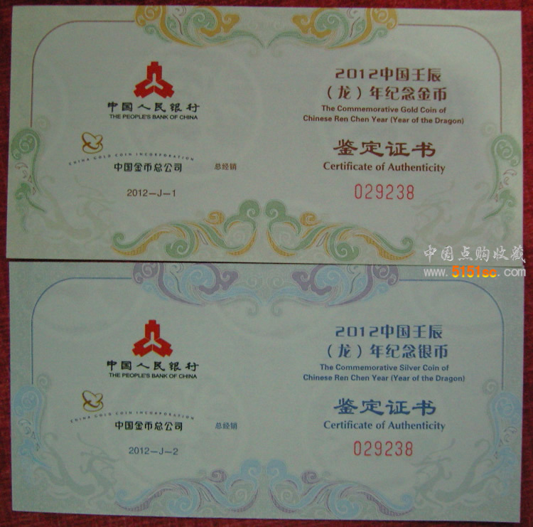 【藏品名称】2012龙年圆形本色金银纪念币(套装)