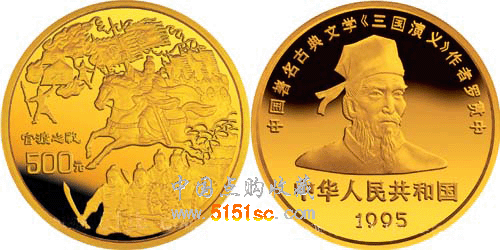 该套本色金质纪念币正面图案为罗贯中头像并刊国名、年号。