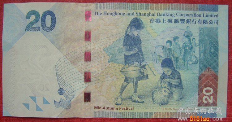 【藏品名称】香港上海汇丰银行港币20元(中秋纪念钞)十张